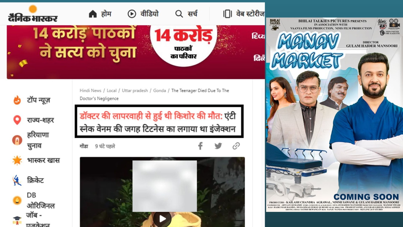 हमने अक्सर बहुत सारे अलग-अलग राज्यों की फिल्में देखीं हैं। ख़ासकर साउथ की फिल्मों का अभी वर्ल्ड वाइड अच्छा खासा क्रेज हो गया है। जो उनकी अपनी बरसों की मेहनत और अपनी जड़ों से जुड़े हुए विषयों पे फिल्म बनाना। कोई सोशल इस्यु पर आधारित फिल्म बनाना। उनकी कमाल की बात ये है की ये लोग संदेश देने वाली फिल्मों को भी मास फिल्म बना देते हैं। जितना संवेदनशील विषय उतना ही रोचक उसे पेश करने का ढंग। हमने अपनी फिल्म ‘‘मानव मार्केट‘‘ को भी बनाने के लिए स्क्रीनप्ले के ट्रीटमेंट का जो तरीका चुना है, वो है दर्शकों के हिसाब का ट्रीटमेंट, रोचकता, रोमांच, इमोशन्स और गीत-संगीत है। जहा प्रॉब्लम है, वही उसका सॉल्यूशन है। जैसे अन्य राज्यों की फिल्मों को उनके कंटेट की वजह से पसंद किया जाता है वैसे ही अपने मेडिकल कॉर्पोरेट कल्चर कंटेट की वजह से छत्तीसगढ़ की तरफ लोगों का ध्यानाकर्षित करेगी हिंदी फीचर फिल्म ‘‘मानव मार्केट‘‘ ये कहना है जी प्रोडक्शन हेड और मैनेजर मनीष तिवारी जी का।